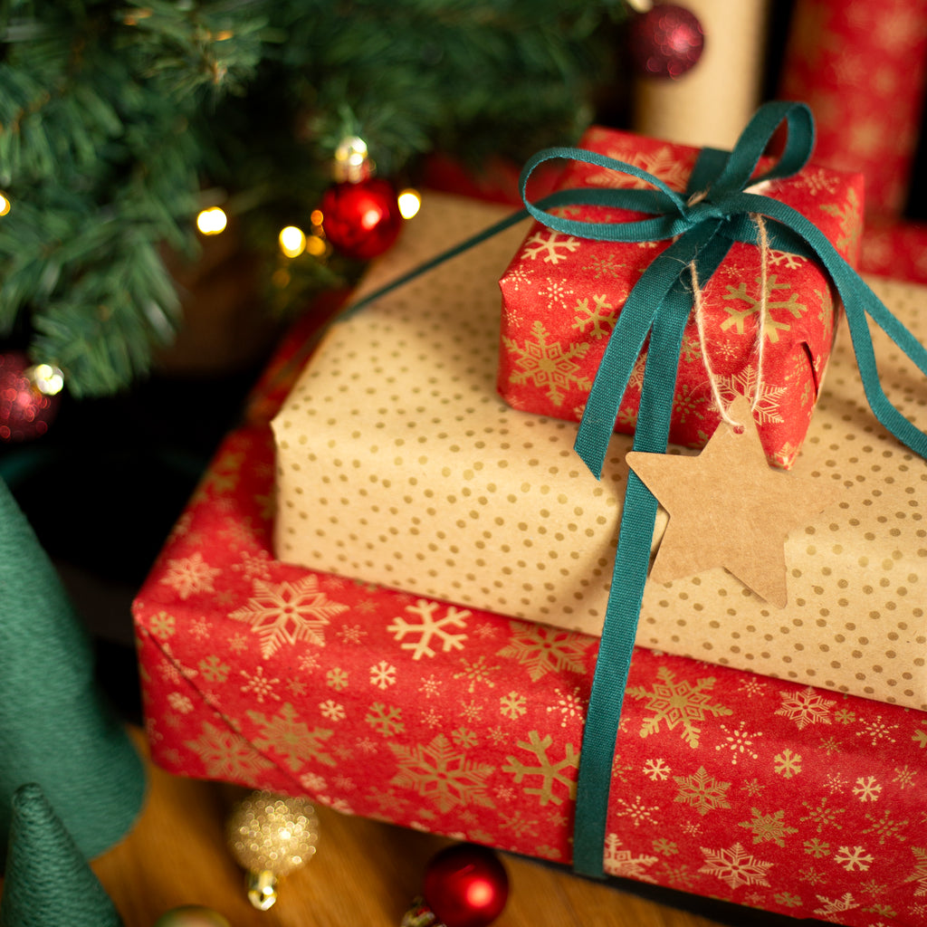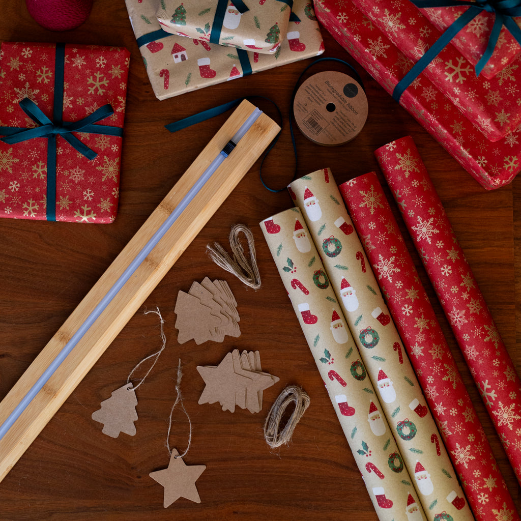 December is here and we are bringing you a BUMPER gift wrap offer to make sure gift Christmas 2025's wrapping is the both the easiest and most beautiful yet! The bundle includes a total of 20m of wrapping paper in two of this years best selling designs; Snowflake & Santa Faces! Our amazing Bamboo Paper Cutter which means you can ditch the stress of scissors and trying to get straight cuts to make wrapping twice as fast! As well as a 5m roll of Biodegradable Dark Green ribbon and 20 brown kraft tags (In Stars & Trees designs) for the perfect finishing touch! This bundle offer really will take the thought and stress out of wrapping this year but please be warned this offer it IS limited as paper stock is running low across the site so make sure you grab this amazing offer while you can!