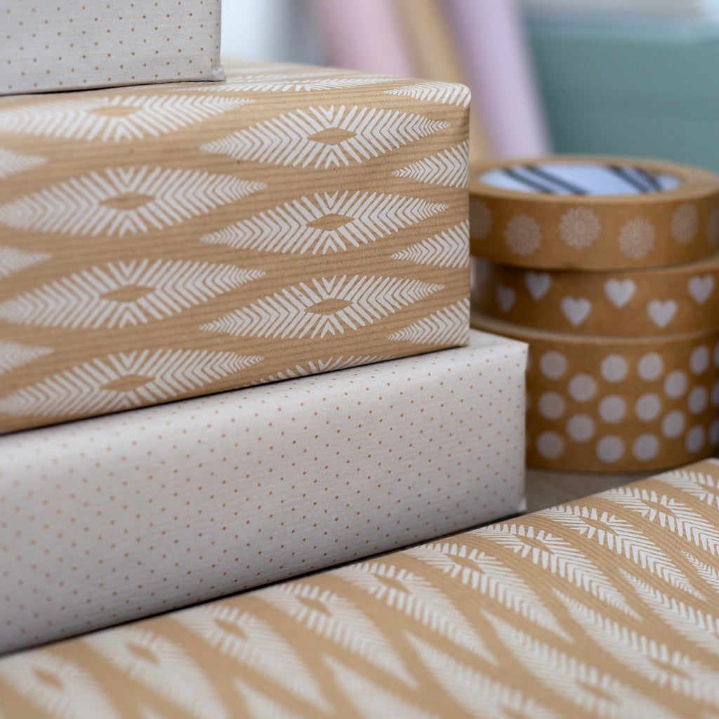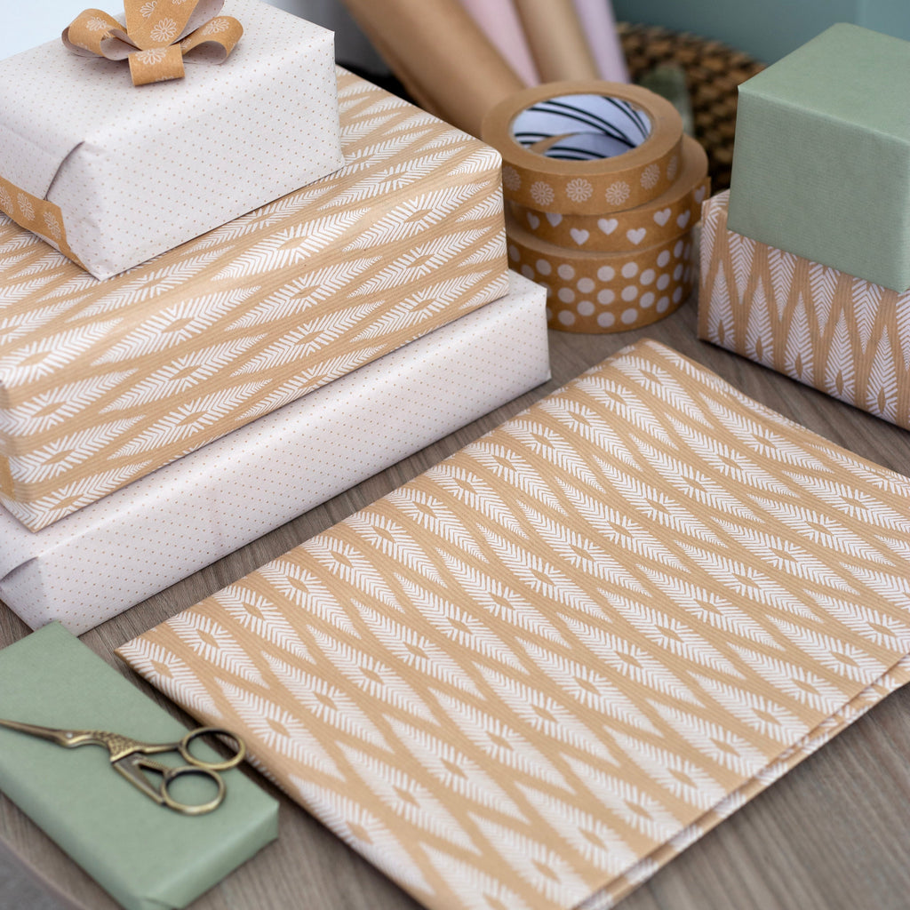 This White Feather Diamond Kraft wrapping paper is 100% recyclable and PEFC certified. The versatile diamond design makes it ideal for year round gifting. Pair with paper tape, jute twine or ribbon to really up your gift wrap game.