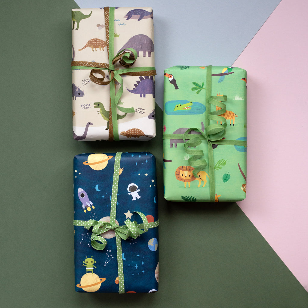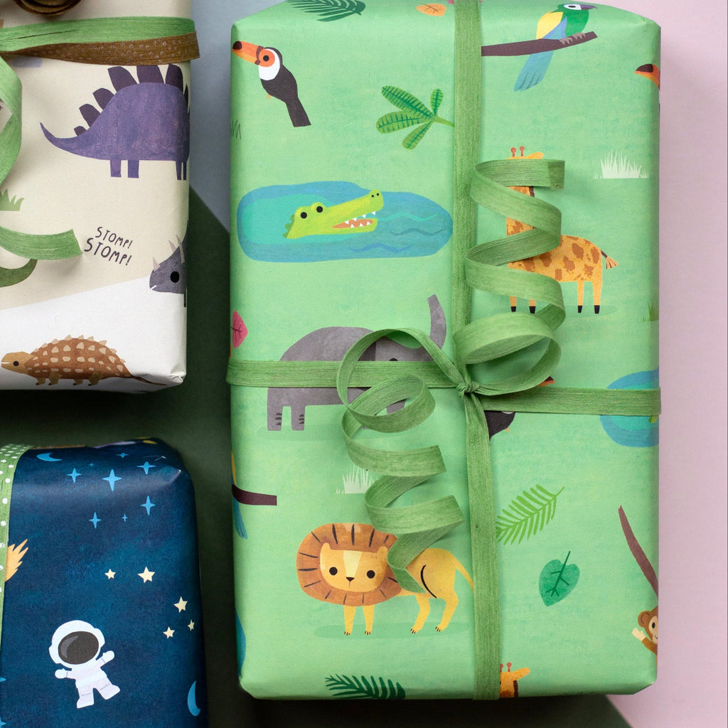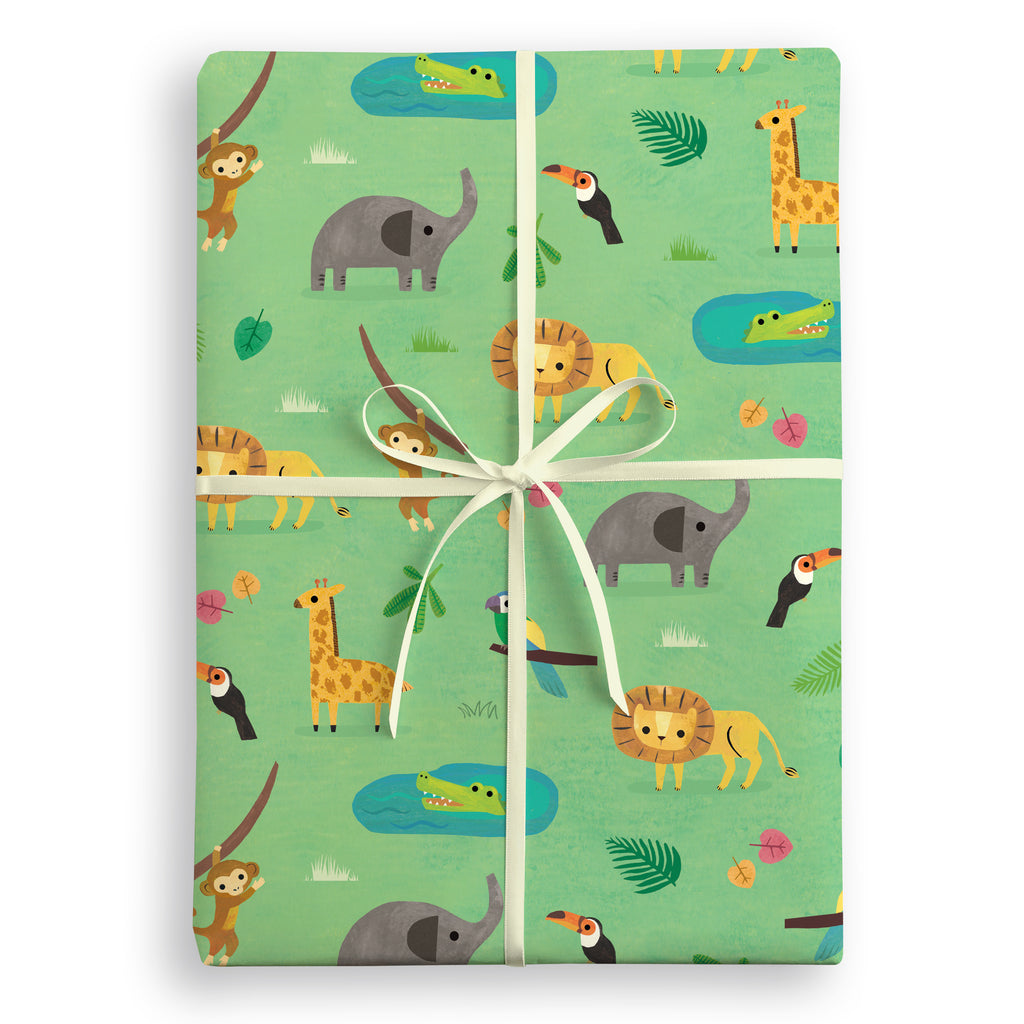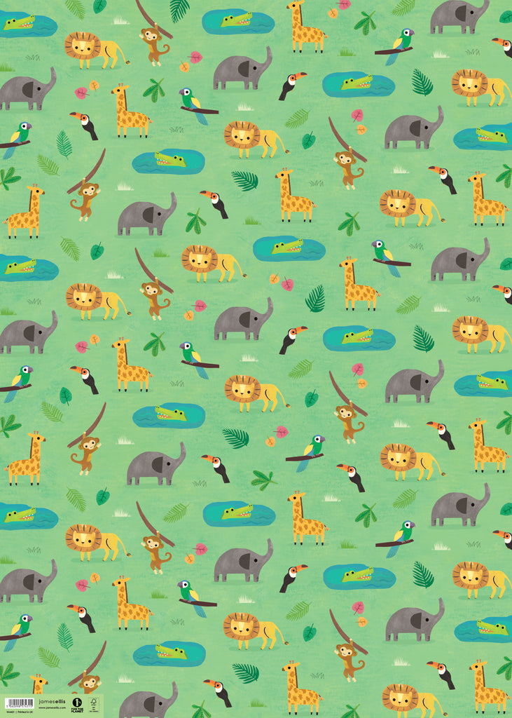 The playful Animal Safari design is the perfect gift wrap to delight the little people in your life. The design features an array of safari animals including lions, elephants, giraffes, monkeys and crocodiles on a vibrant green background.