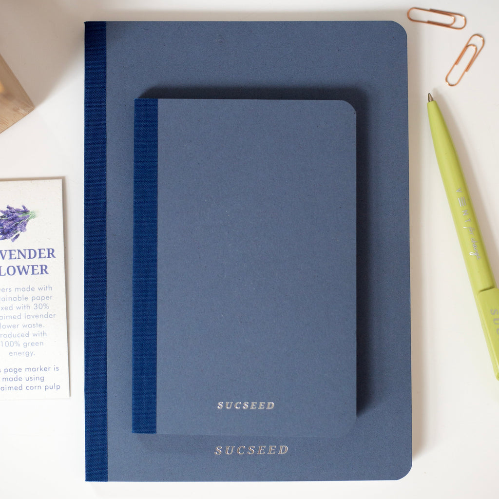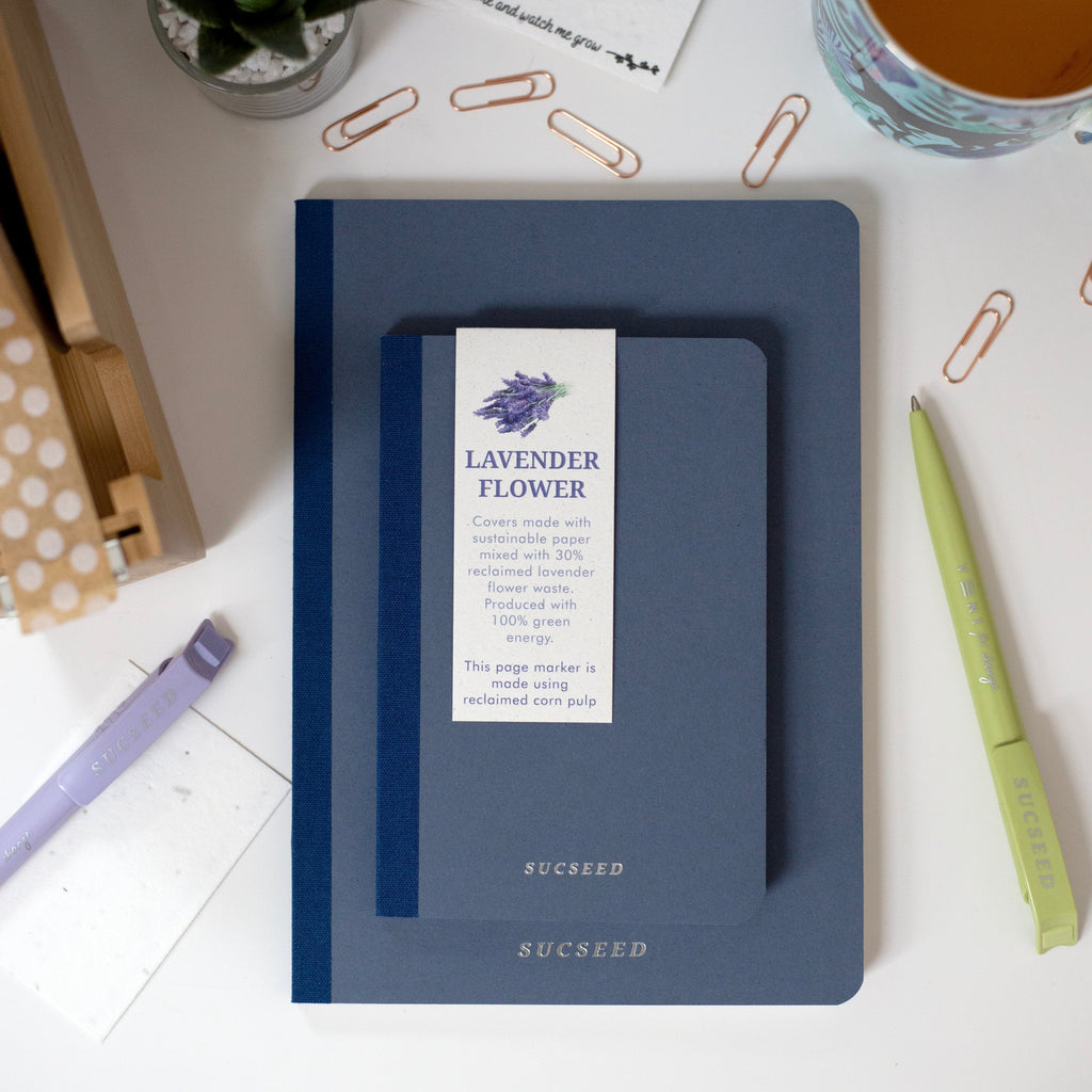 The cover is made with sustainable paper mixed with 30% reclaimed lavender flower waste and is produced with 100% green energy.