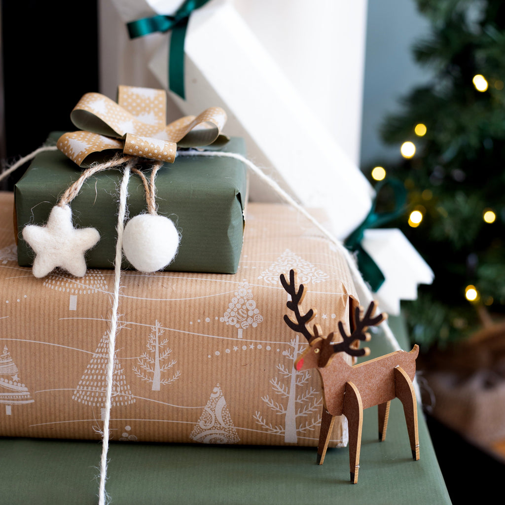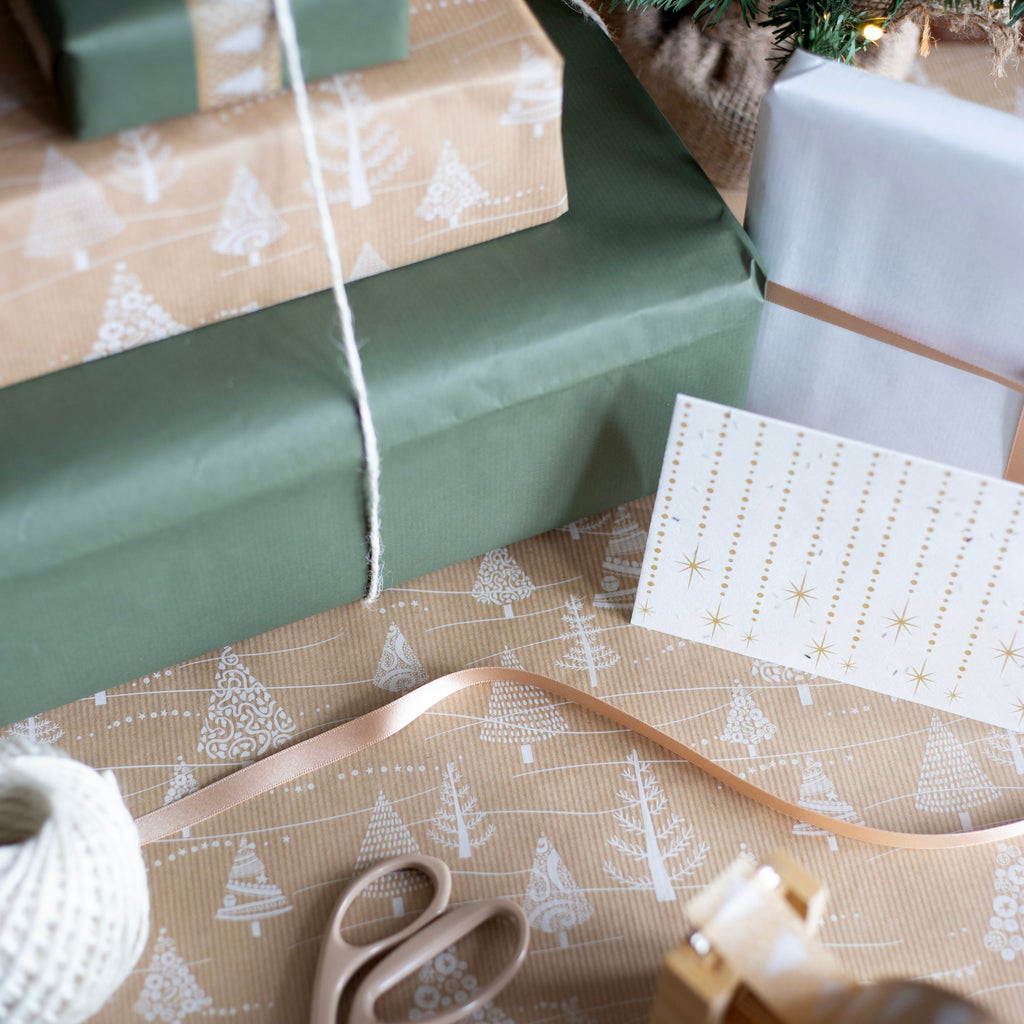 Our White Christmas tree Kraft paper is back and this time we have two new sizes. With the new 1.8m sheet and 10m rolls there will be a size to suit no matter your needs. Not only beautiful, this paper is 100% recyclable and PEFC certified so you don't have to sacrifice the planet for pretty wrapping this year. The perfect festive print, this gorgeous design is sure to make your gifts stand out under any tree. Pair with one of our papers (we love it with our khaki duo sheets) patterned paper tapes, or why not add some string or ribbons to make your gifts really stand out this year.