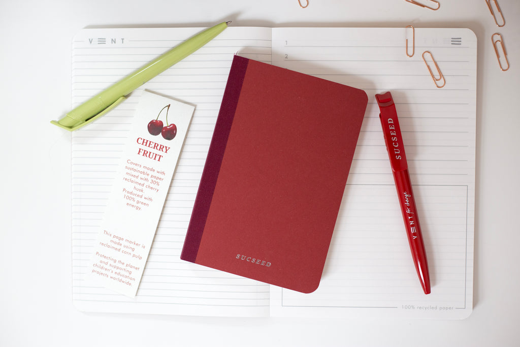 The cover is made with sustainable paper mixed with 30% reclaimed cherry fruit waste and is produced with 100% green energy.